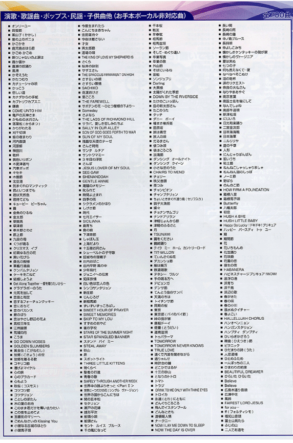 | ★主要機能★ キー設定、エコー設定、テンポ設定、予約機能(最大100曲)、連続演奏機能、採点機能、字幕、録音・再生機能、一時停止機能、ガイドメロディー音量調整機能 ※1 、歌詞スタート表示、ガイドメロディー音色選択機能 ※1 、基本操作ナビ |