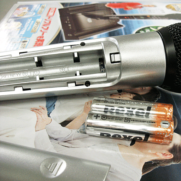マイクの裏側を開けて付属の単三電池を入れてください