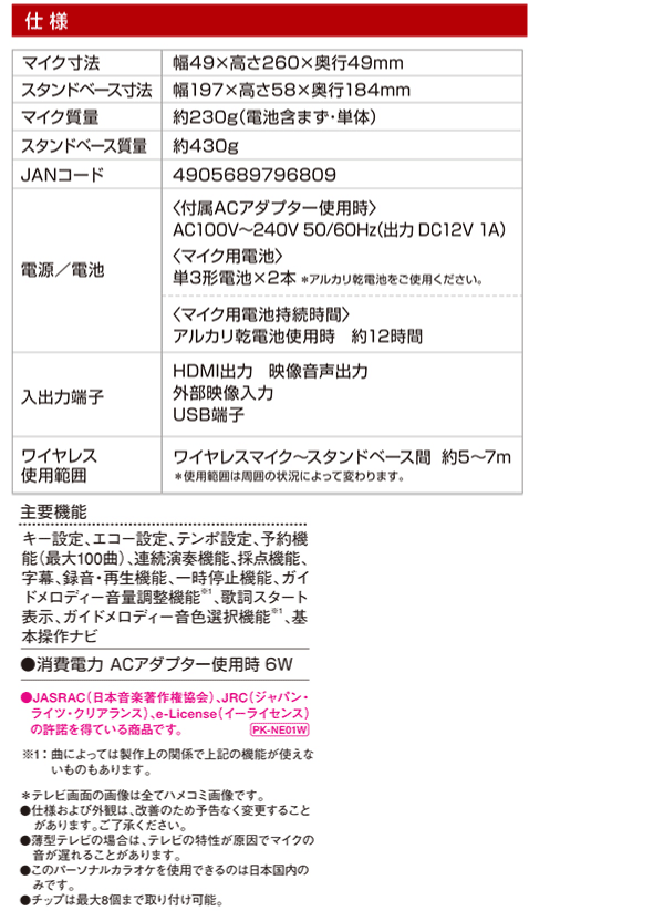 ※1:曲によっては製作上の関係で上記の機能が使えないものもあります。 *テレビ画面の画像は全てハメコミ画像です。 ●仕様および外観は、改善のため予告なく変更することがあります。ご了承ください。 ●薄型テレビの場合は、テレビの特性が原因でマイクの音が遅れることがあります。 ※このパーソナルカラオケを使用できるのは日本国内のみです。 ※仕様および外観は、改善のため予告なく変更することがあります。ご了承ください。 |