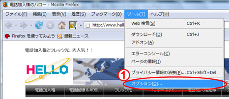 1.ブラウザの「ツール」を開き、「オプション」を選択。