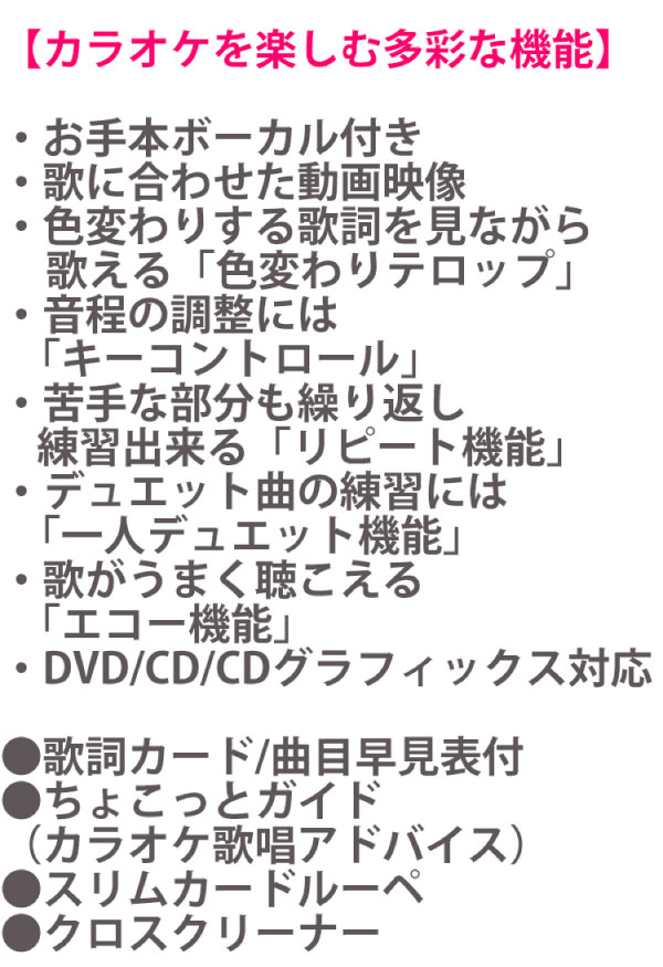 | ●仕様および外観は、改善のため予告なく変更することがあります。ご了承ください。 ●このカラオケを使用できるのは日本国内のみです。 |