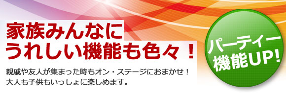楽しく脳を活性化させる“暗算ゲーム”。お子様もいっしょ楽しめる“にボイスダーツ301”。おなじみの“ビンゴゲーム(2種)”“五目ならべ”等パーティーに欠かせないゲームを5種類内蔵しています。