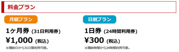 【料金プランは1ヶ月券:1,000円(税込)と1日券:300円(税込)がございます】