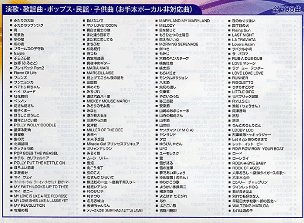 | ★主要機能★ キー設定、エコー設定、テンポ設定、予約機能(最大100曲)、連続演奏機能、採点機能、字幕、録音・再生機能、一時停止機能、ガイドメロディー音量調整機能 ※1 、歌詞スタート表示、ガイドメロディー音色選択機能 ※1 、基本操作ナビ |