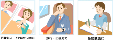 音の出ない強い振動によりまわりの人に迷惑をかけずに起きられます。 |